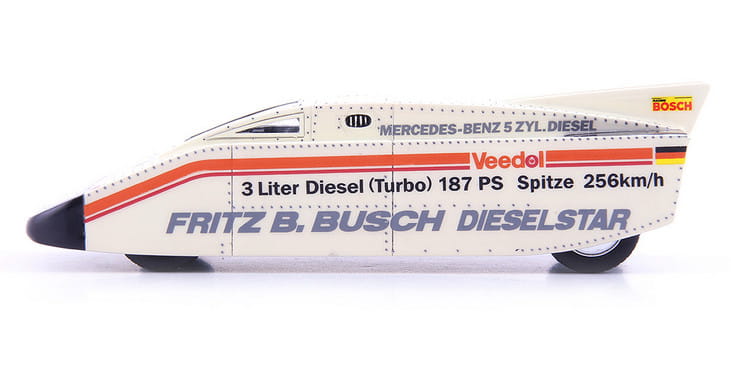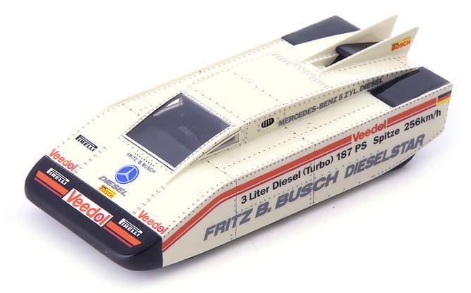 AutoCult odradza dawno zapomniane marki samochodów w miniaturowej formie. W ofercie znajdziemy modele wyróżniające się niezwykłym kształtem lub przełomową konstrukcją. Każdy model jest starannie wykonany ręcznie z żywicy, podlega ścisłej kontroli jakości i wykonany jest w limitowanej serii 333 sztuk. W 1975 roku obywatel Niemiec postanowił w niezwykły sposób zademonstrować możliwości silnika diesla. Dzięki licznym artykułom publikowanym w „Sternie” i magazynie „Quick” oraz miłością do jazdy wyczynowej 52-letni dziennikarz Fritz B. Busch był dobrze znany niemieckim entuzjastom motoryzacji. W swoim warsztacie w zamku w Wolfegg pracował wytrwale nad swoim bolidem, który powstał w oparciu o podwozie samochodu wyścigowego Formuły 2. Aby poprawić osiągi standardowego, 79-konnego, pięciocylindrowego silnika Mercedesa W115 240 D 3.0, zainstalował turbosprężarkę AIResearch, mocniejszą pompę wtryskową Bosch i – dzięki drobnym modyfikacjom cylindrów – zredukował (zgodnie z przepisami) pojemność jednostki do 2999 cm3. Te zabiegi pozwoliły na osiągnięcie 187 KM mocy. Busch opracował i wykonał z blachy aluminiowej nadwozie w kształcie klina. Do tego celu użył 3000 nitów. Nadwozie zostało celowo ukształtowane tak, aby wyeliminować unoszenie, które mogłoby zdestabilizować pojazd przy dużej prędkości. Swoje dzieło ochrzcił mianem „Dieselstar”. Do próby bicia rekordu wybrał tor testowy Volkswagena w Ehra-Lessien w Niemczech. 16 listopada 1975 roku Fritz Busch wsiadł do swojej maszyny w kształcie klina i zaczął przyspieszać. Przejechanie od zera do 100 km/h zajęło mu 5,6 sekundy, ale był to tylko początek. Pod koniec biegu uzyskał prędkość 253,7 km/h! Ta maksymalna prędkość umożliwiła kierowcy i samochodowi ustanowienie rekordu 136,1 km/h ze startu zatrzymanego na dystansie jednego kilometra. To było coś! Szczególnie w obliczu poprzedniego rekordu wynoszącego 113,4 km/h. W ten sposób Fritza Buscha uwieczniono jako odnoszącego sukcesy rekordzistę w klasie pojazdów z silnikami wysokoprężnymi. Tor testowy VW stanowił wyzwanie, ponieważ był zakrzywiony, a nie długi i prosty, co ma zwykle miejsce podczas prób bicia rekordów. Fritz B. Busch zmarł w 2010 roku w wieku 88 lat.